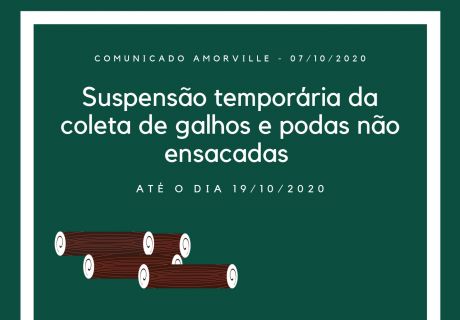 A Amorville informa a todos os associados que nos dias 14 e 16 de outubro não haverá recolhimento de galhos...